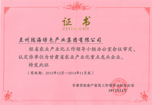 蘭州隴海綠色產業集團公司農業產業化重點龍頭企業證書